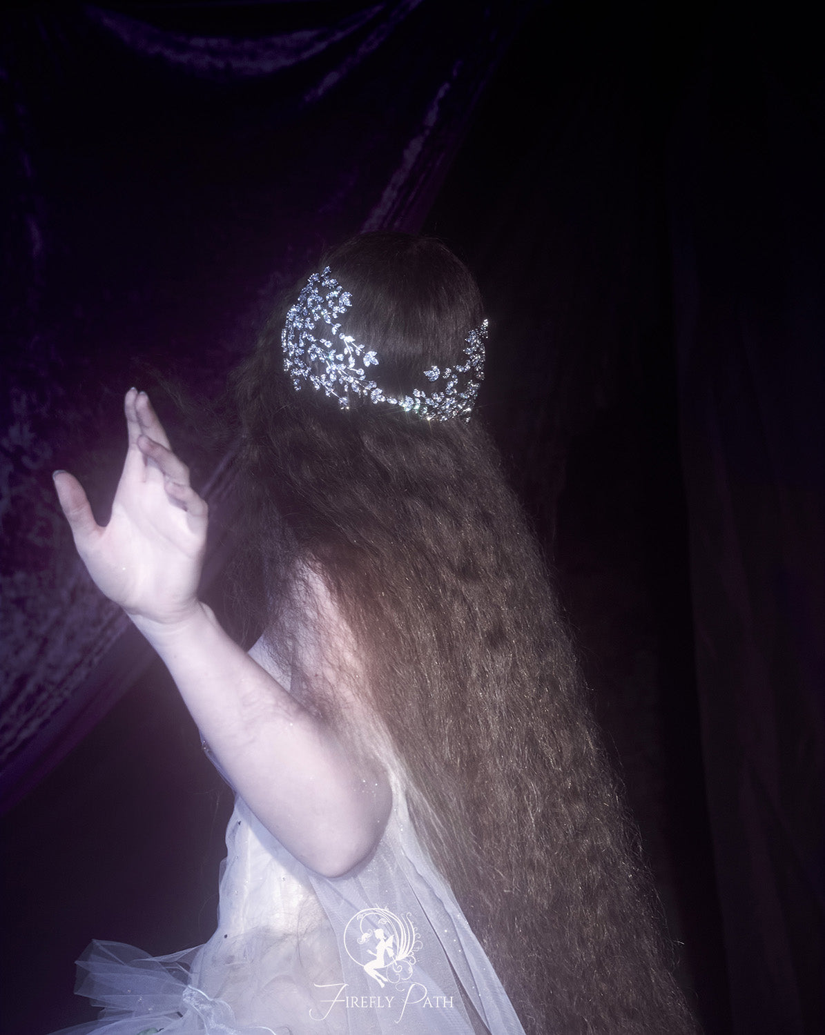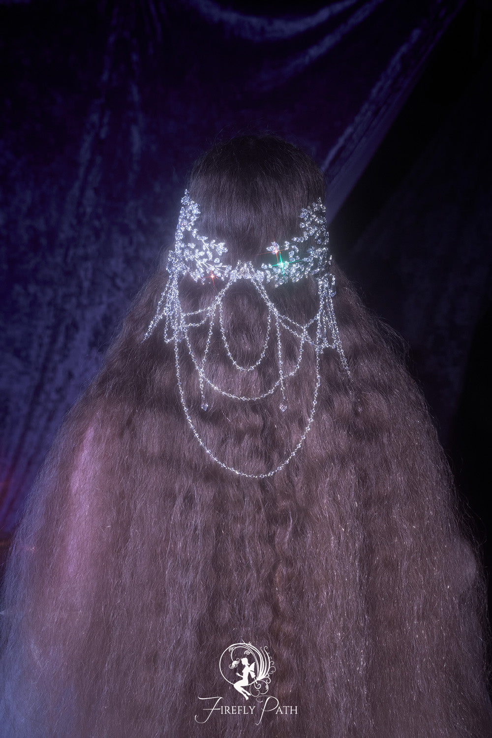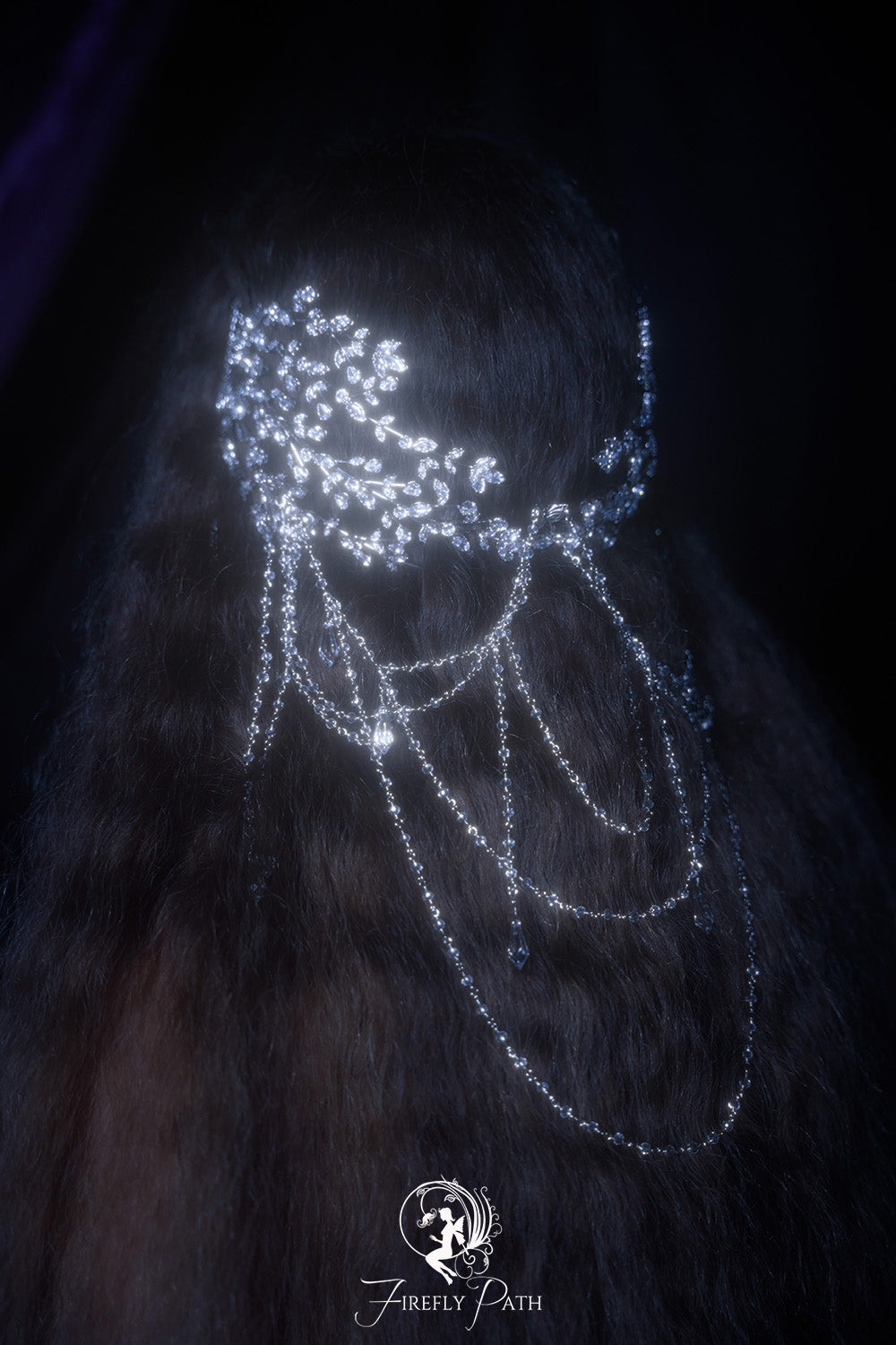 The intricate design includes cascading pearls and delicate golden chains, creating a regal and ethereal aesthetic perfect for fantasy-inspired weddings, or magical photoshoots.