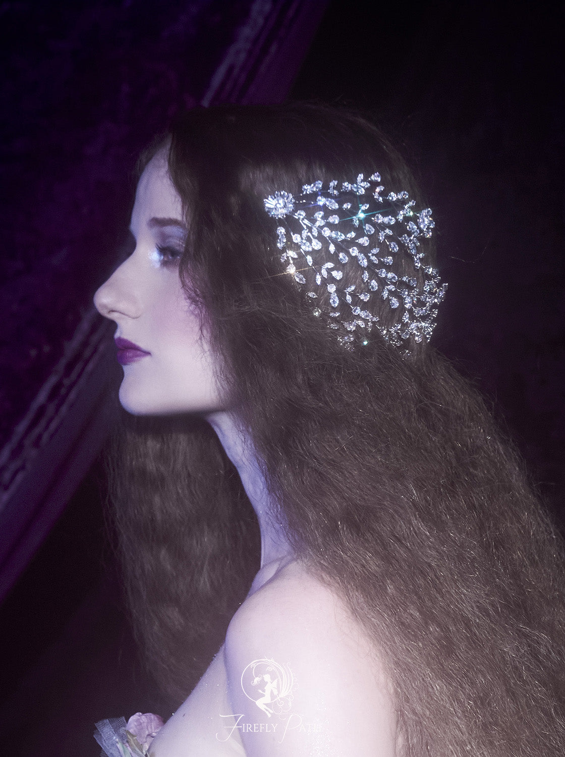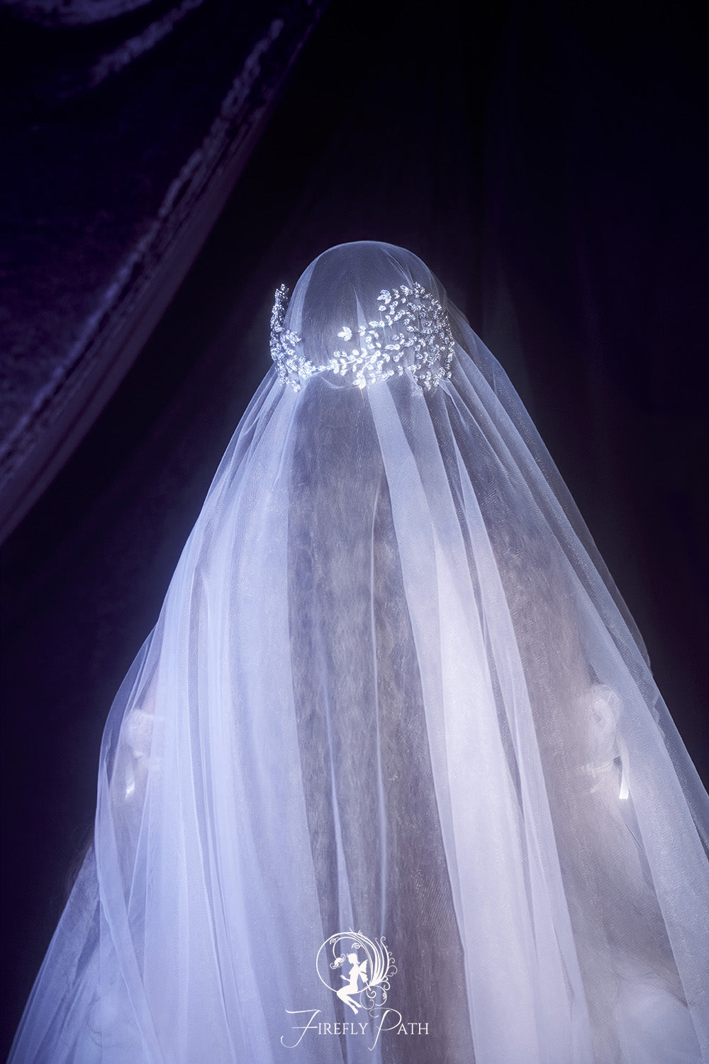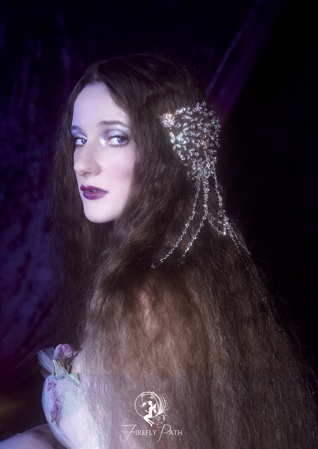 The intricate design includes cascading pearls and delicate golden chains, creating a regal and ethereal aesthetic perfect for fantasy-inspired weddings, or magical photoshoots.