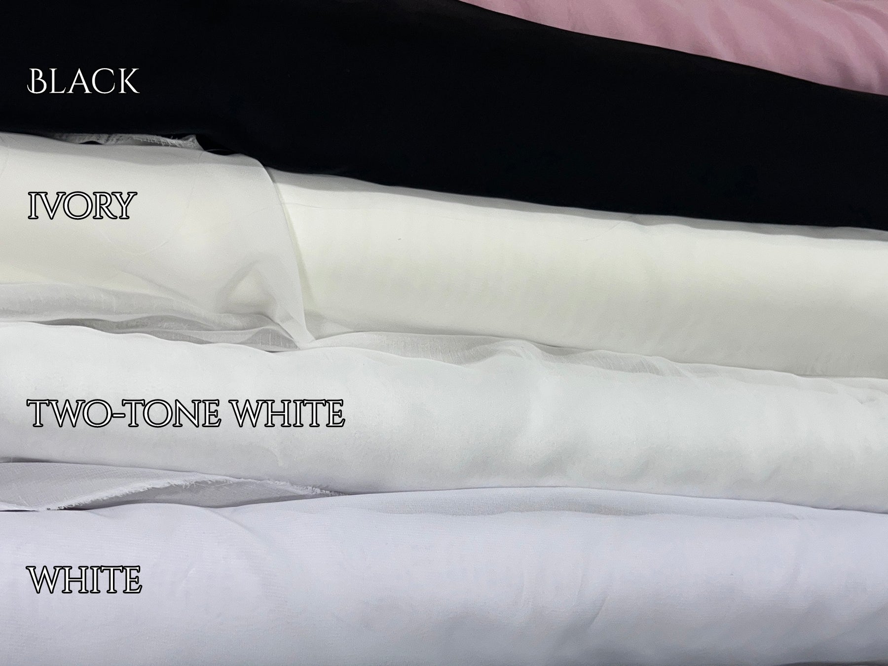 Fabrics - Bridal satin, faux dupioni, poly chiffon, lace, and crystal clasp.